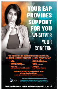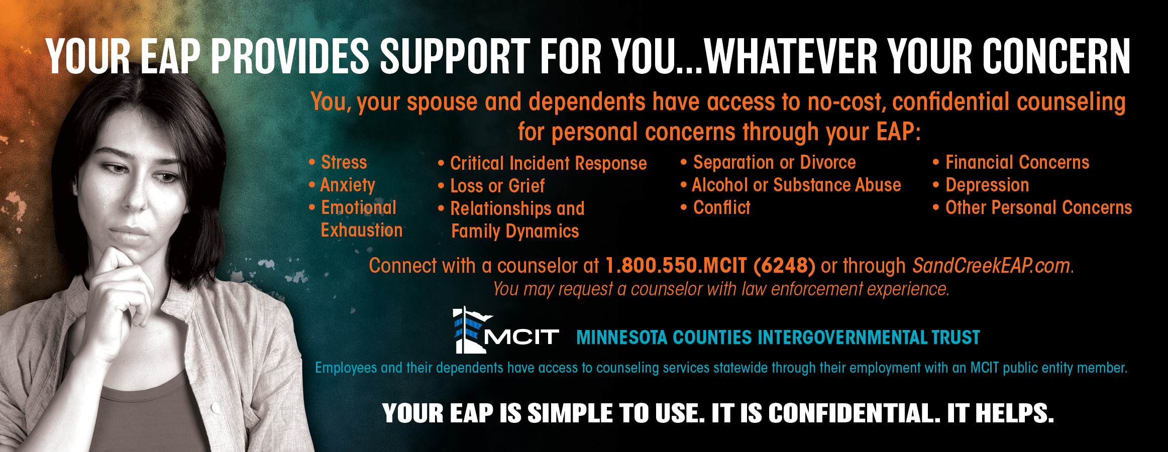 Promote the Employee Assistance Program to employees and officials using the below poster and digital image. It reminds law enforcement staff the EAP has professional counselors with experience assisting them through the unique experiences and challenges of working in law enforcement.