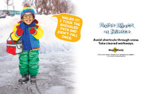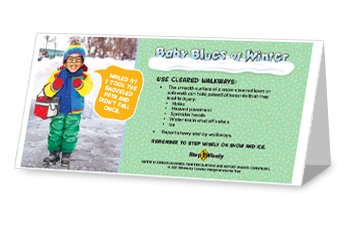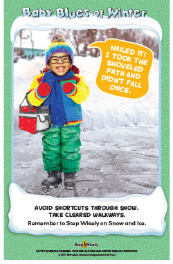 Help prevent and lessen winter slip, trip and fall incidents by using the below Step Wisely program poster, table tent and digital image. It reminds individuals to avoid a slip and fall injury by taking cleared paths, rather than shortcuts through snow-covered lawns or sidewalks.