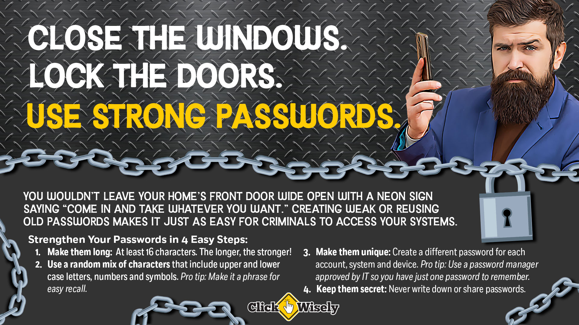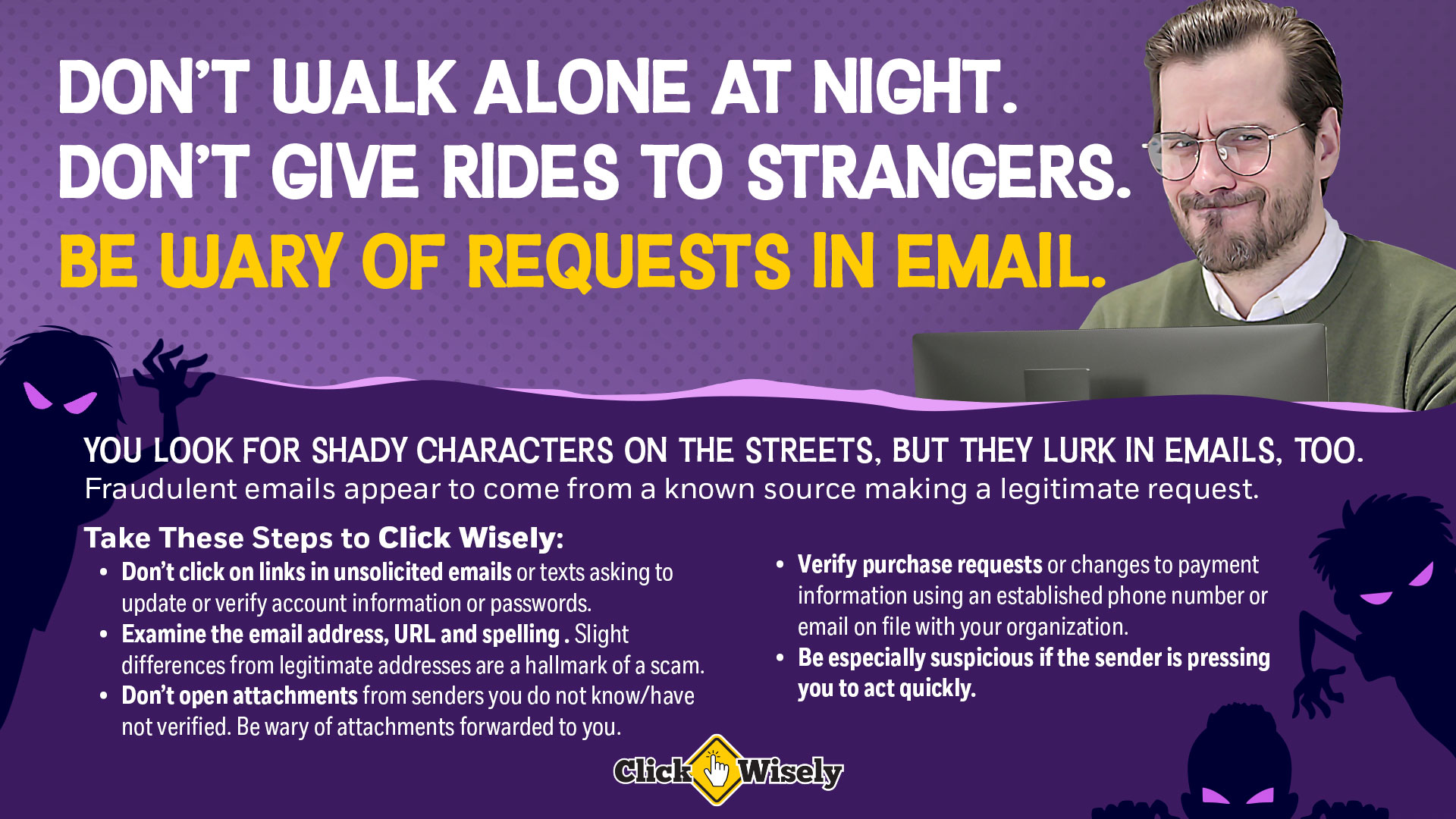 The below email security digital images help employers remind staff to Click Wisely. The images educate employees about their responsibility for cybersecurity and the simple steps they should take, particularly as it relates to using email.