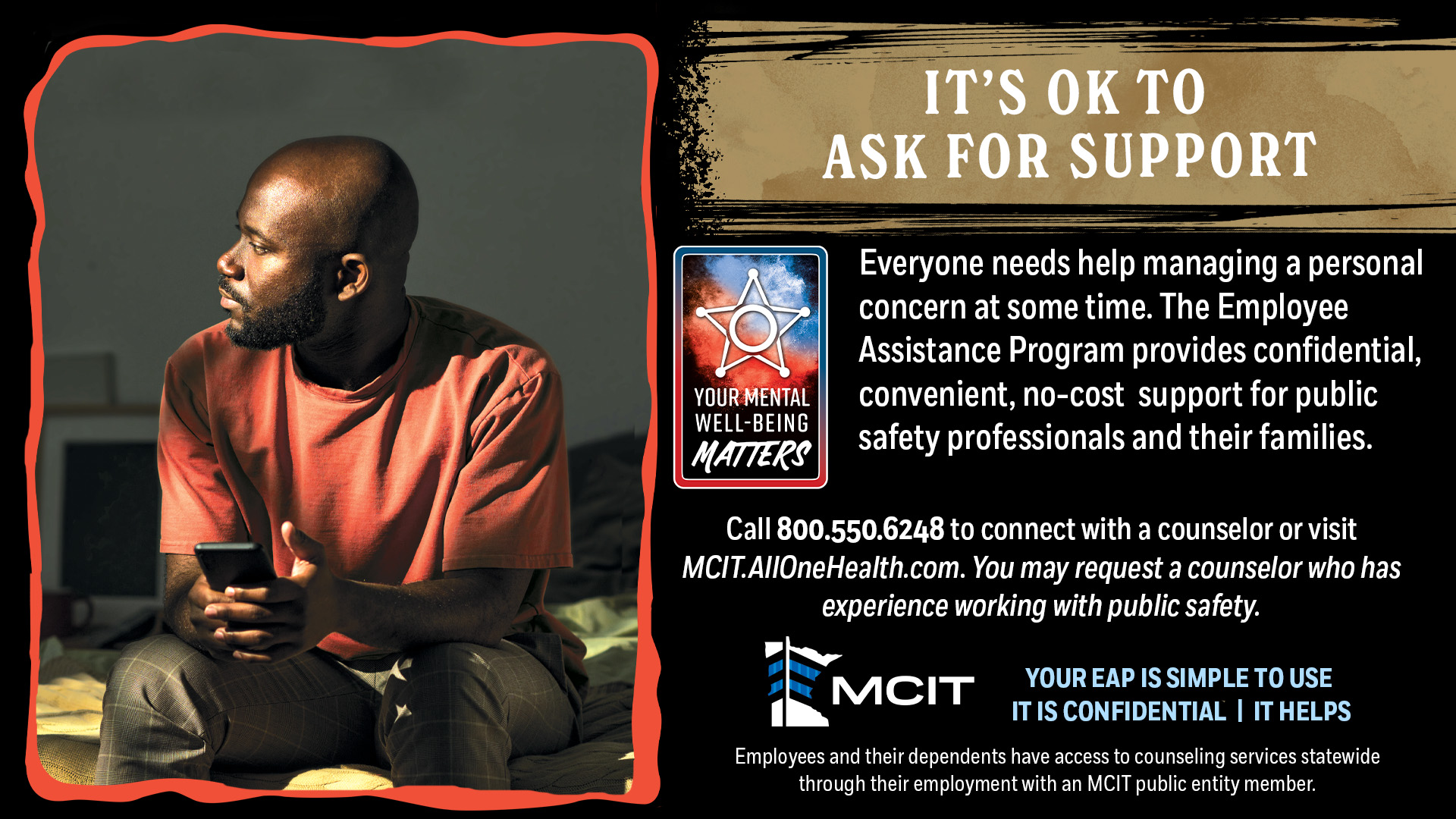 Promote the Employee Assistance Program to employees and officials using the below poster and digital image. It reminds public safety staff that it’s OK to ask for help and that everyone needs support at some time. The EAP can assist them with the unique challenges of being a public safety professional.