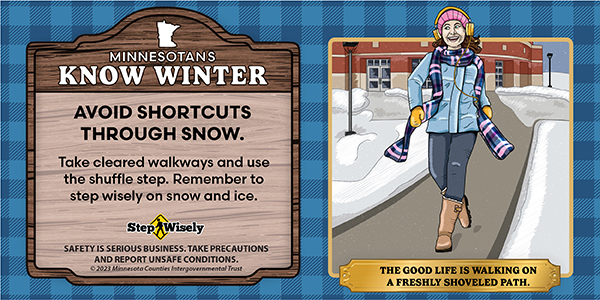 MCIT’s Step Wisely program helps make slip, trip and fall prevention efforts easy for its members. Slip, trip and fall incidents are particularly prevalent during Minnesota winters. Providing your employees and the public information to help them make safer behavior choices could keep your employees from being injured and save your organization significant costs, time and grief related to those injuries.