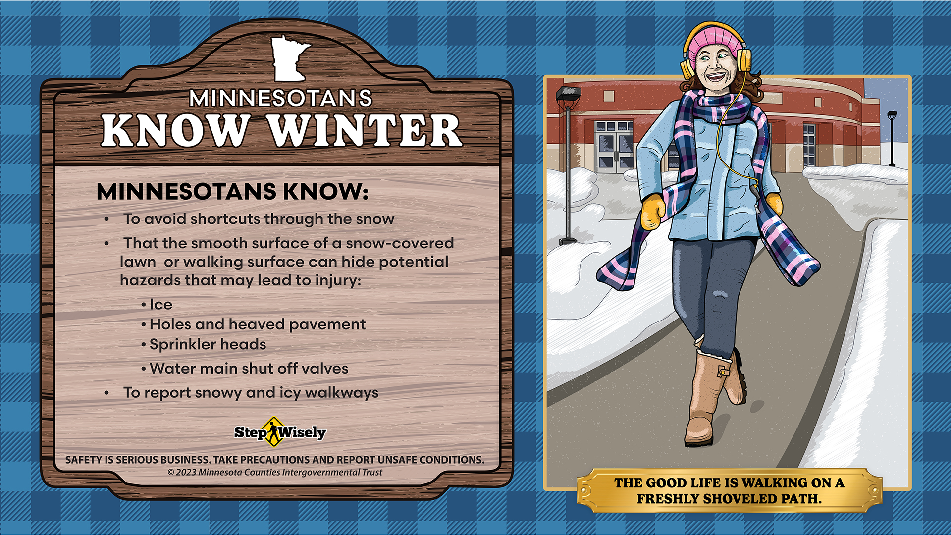MCIT’s Step Wisely program helps make slip, trip and fall prevention efforts easy for its members. Slip, trip and fall incidents are particularly prevalent during Minnesota winters. Providing your employees and the public information to help them make safer behavior choices could keep your employees from being injured and save your organization significant costs, time and grief related to those injuries.