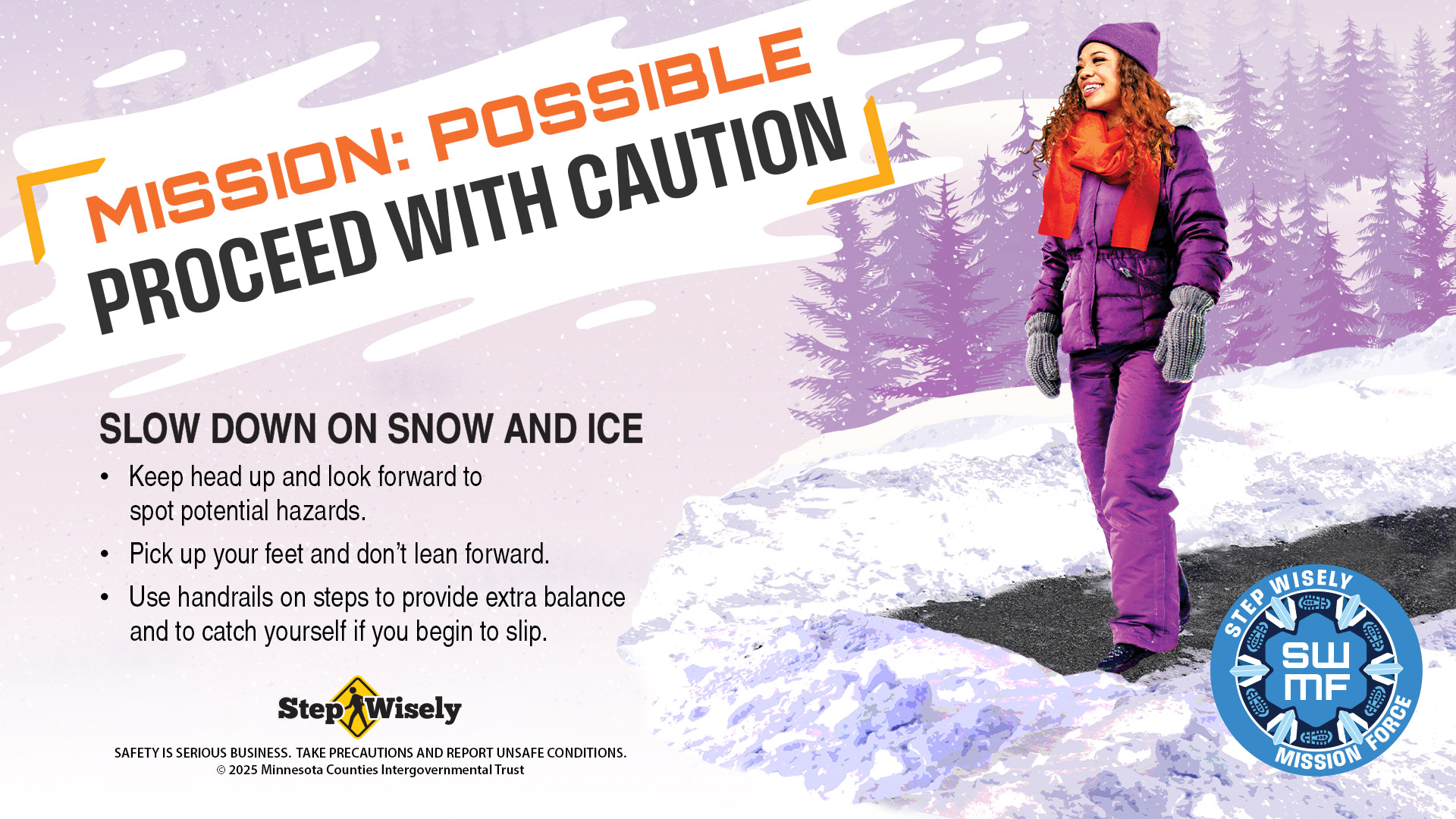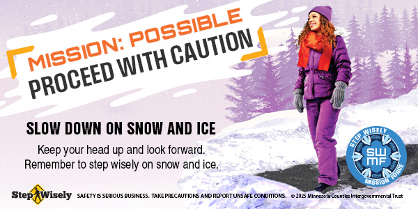 MCIT’s Step Wisely program helps make slip, trip and fall prevention efforts easy for its members. Slip, trip and fall incidents are particularly prevalent during Minnesota winters. Providing your employees and the public information to help them make safer behavior choices could keep your employees from being injured and save your organization significant costs, time and grief related to those injuries.