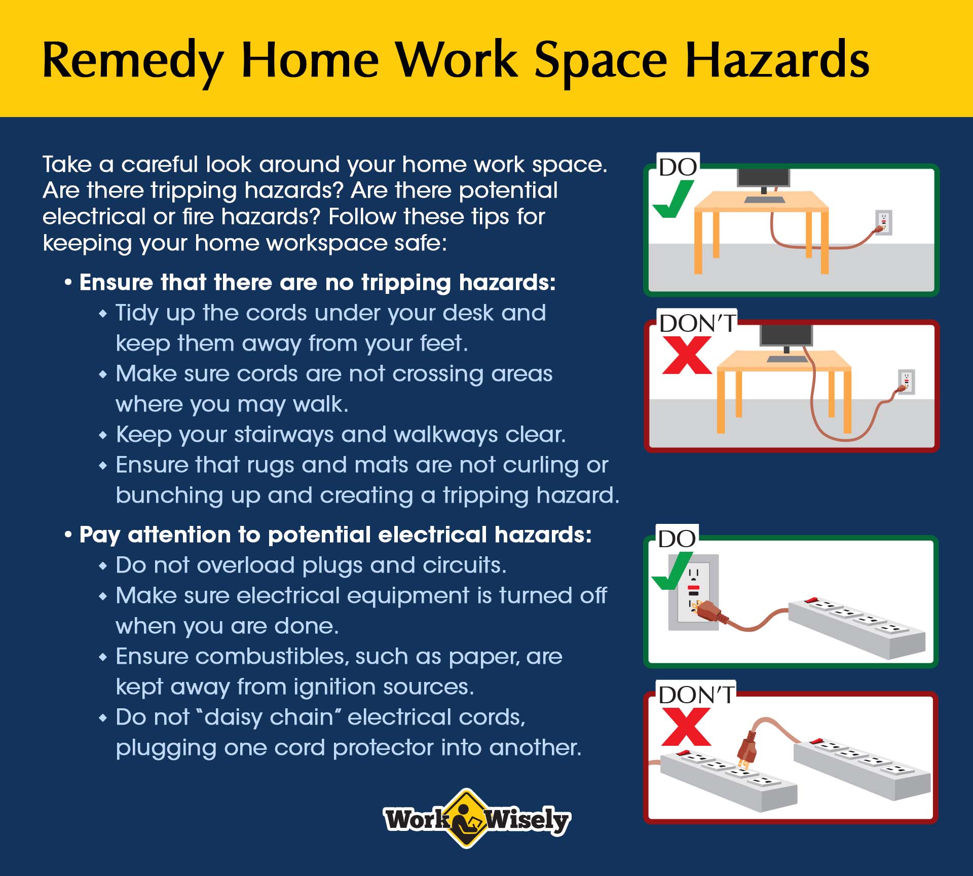 Remedy Home Work Space Safety Hazards safety message gives information and illustrations for fixing hazards in a home work space.