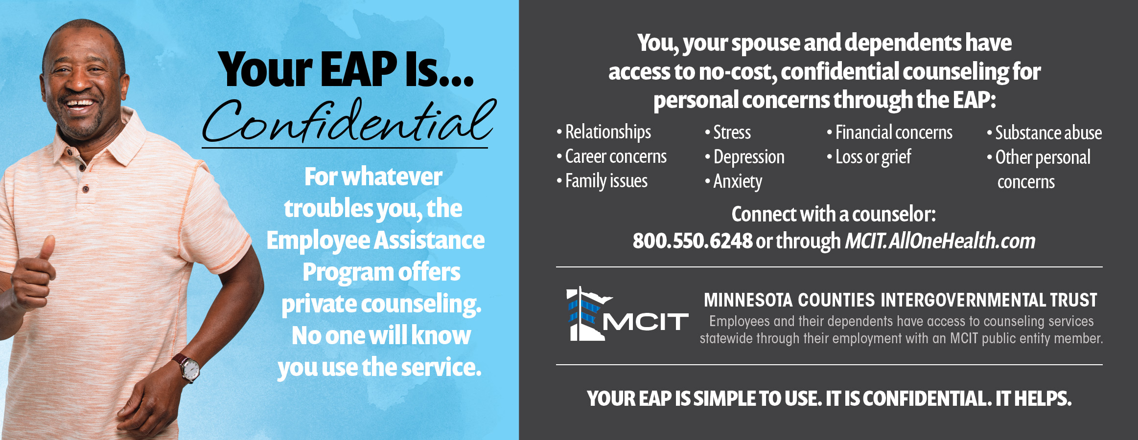 Promote the Employee Assistance Program to employees and officials using the below poster and digital image. It reminds individuals that using the EAP is confidential, so they can be comfortable reaching out for support without their employer or colleagues knowing.