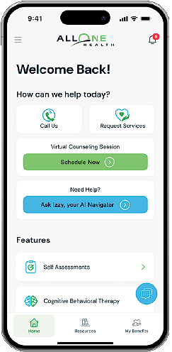 Mobile phone screen shows AllOne Health appThe AllOne Health member portal and app may not be consistent with an organization’s policies and practices. Through these tools, employees have access to volumes of services, resources and links, some of which: